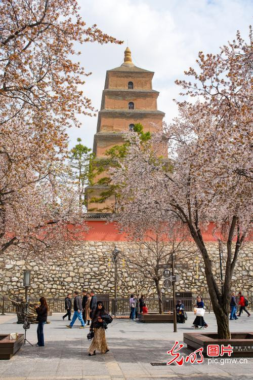 2026年3月18日,陕西省西安市雁塔区大雁塔景区内,成片紫叶李迎春洞开,眩惑市民旅客驻足赏景、拍照眷顾。(张成摄/光明图片)