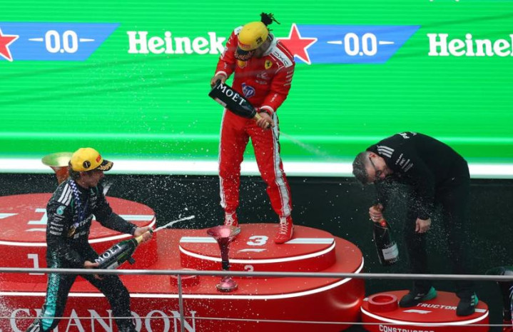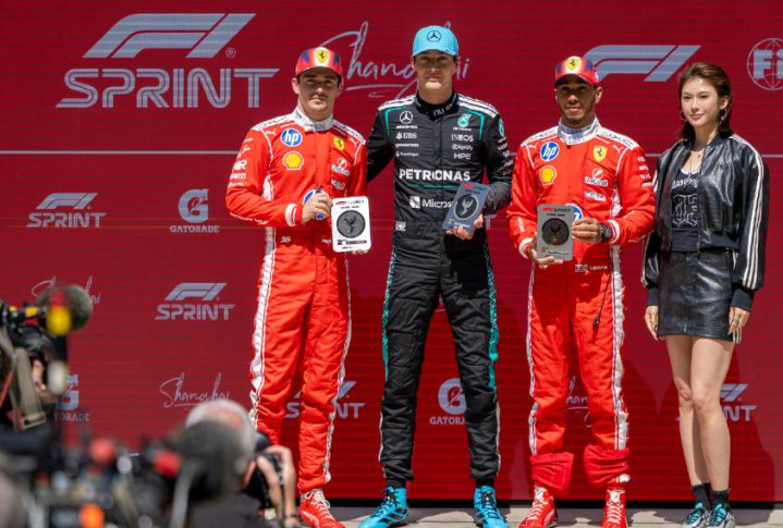 为冠亚季军拉塞尔、勒克莱尔、汉密尔顿完成了受奖。