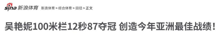 新浪体育|吴艳妮100米栏12秒87夺冠 创造本年亚洲最恋战绩!
