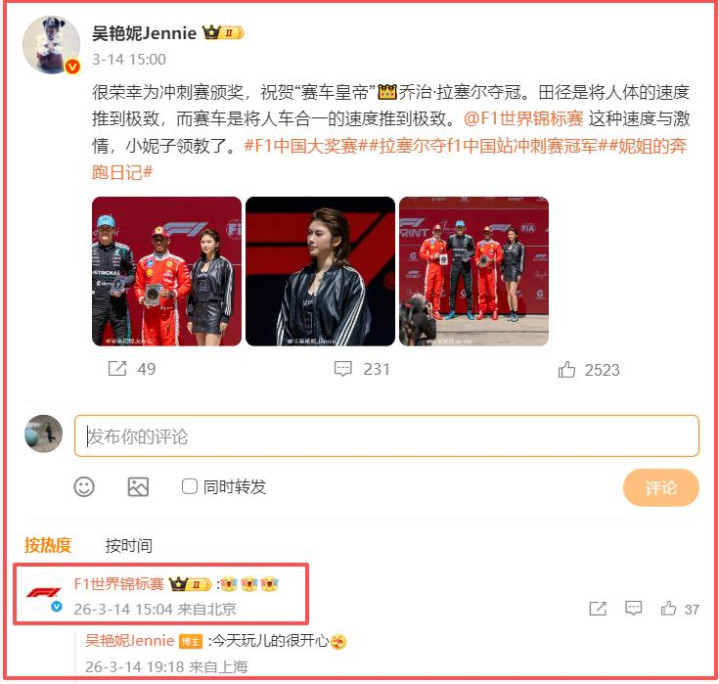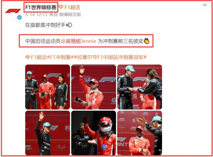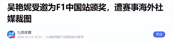 九派体育|吴艳妮受邀为F1中国站受奖,遭赛事国外社媒裁图