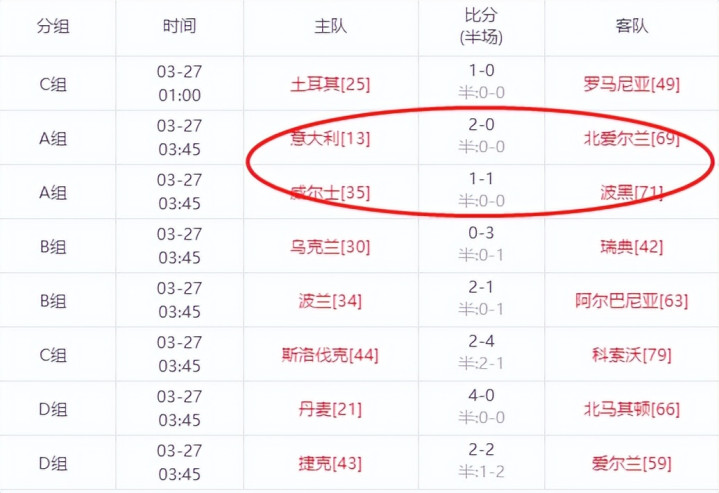 此前2届天下杯,前天下杯冠军意大利队均留步世初赛附加赛,此次世初赛,意大利队小组赛中再遇勤劳,2回合输给挪威队,只不错小组第2身份去踢附加赛。世初赛欧洲区附加赛一共16队,4个小组,每组踢2场,争夺4张天下杯门票。北京工夫3月27日凌晨,意大利队最初对阵北爱尔兰,比赛中,托纳利上半场打进1球,下半场基恩再进1球,终末意大利队2-0征服敌手,晋级附加赛决赛,离天下杯只差1场。