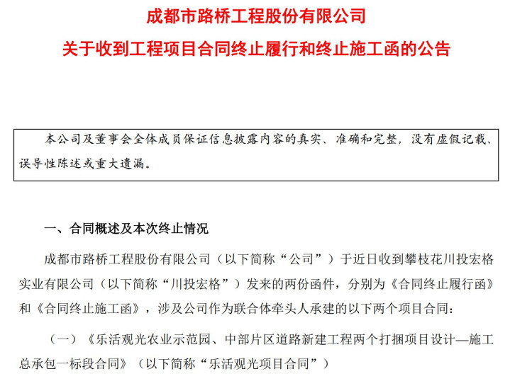 公告走漏,成都路桥收到川投宏格发来的函件,被片面远离了两个紧要工程技俩标部分或一王人合同。