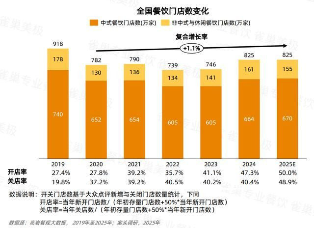 《2026中国考中餐饮白皮书》预测,2025年,寰宇餐饮门店数约825万家,关店率从2022年的35.7%升至48.9%。同期,开店率也在捏续攀升,预测2025年达到50%,创下新高。