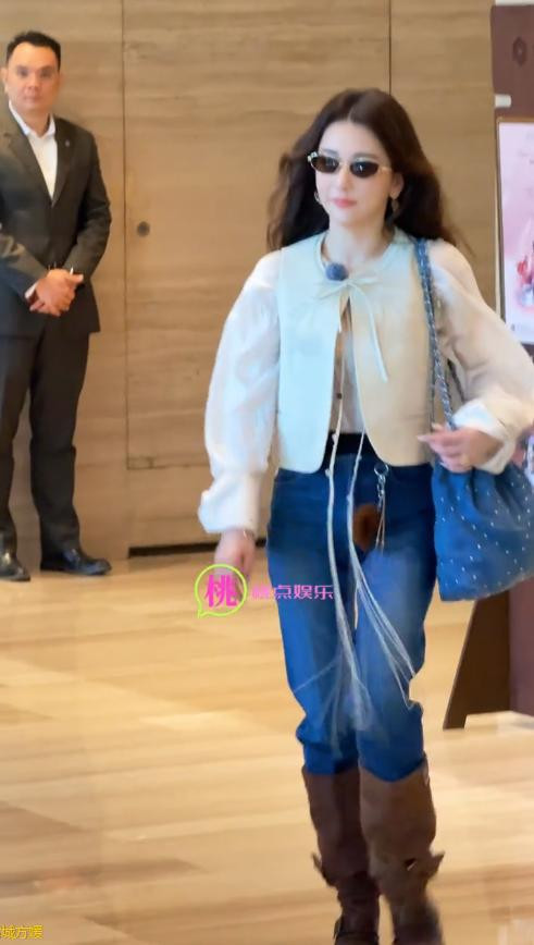 她穿了一件白色的外衣,袖子作念得相等宽大,显得总共这个词东说念主很肥美,下半身搭配了一条往常的牛仔裤,脚上是一对棕色的长筒靴。