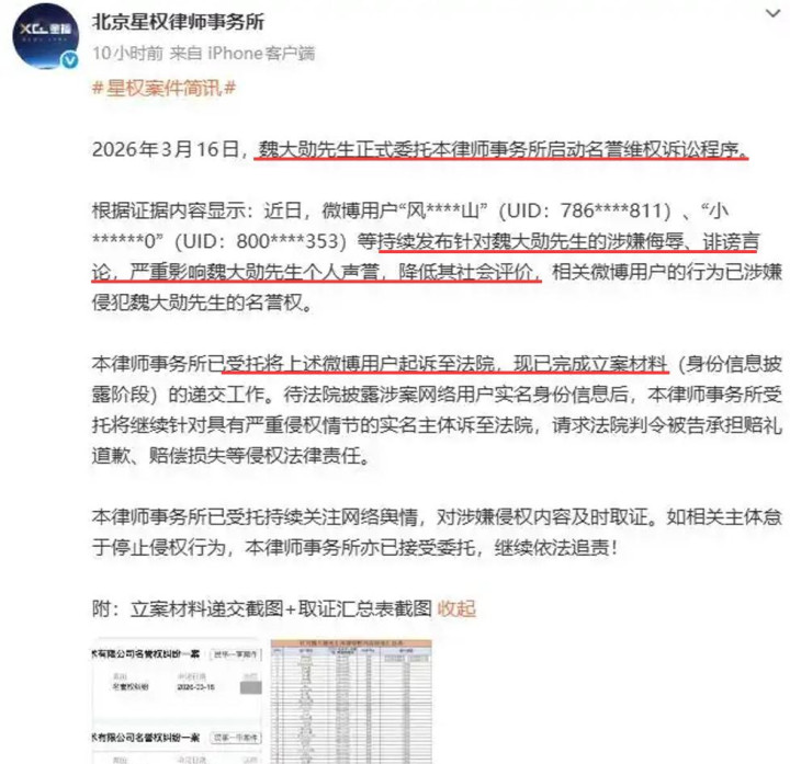 2026年3月16日,魏大勋讲求对多个平台的38名用户拿起名誉权诉讼。