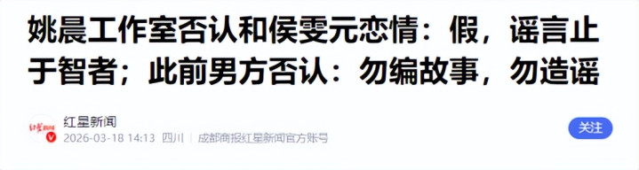 姚晨责任室否定和侯雯元恋情:假,谎话止于智者;此前男方否定:勿编故事,勿谴责——红星新闻