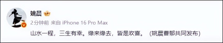 2026年3月16日,姚晨和曹郁长入发布仳离声明。