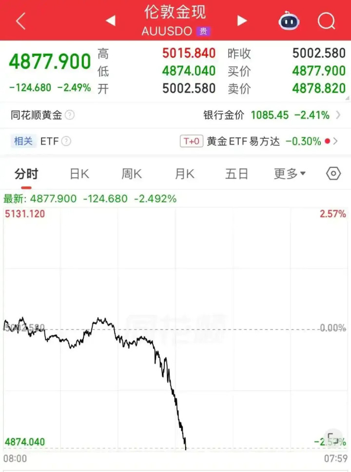 3月18日,海外金价俄顷直线跳水。规则发稿,现货黄金跌逾2%,跌破4900好意思元/盎司关隘,创一个月来低位。
