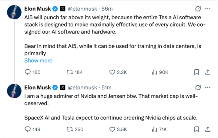 在这条动态中,马斯克写说念:“SpaceXAI和特斯拉瞻望将陆续大规模订购英伟达芯片。”