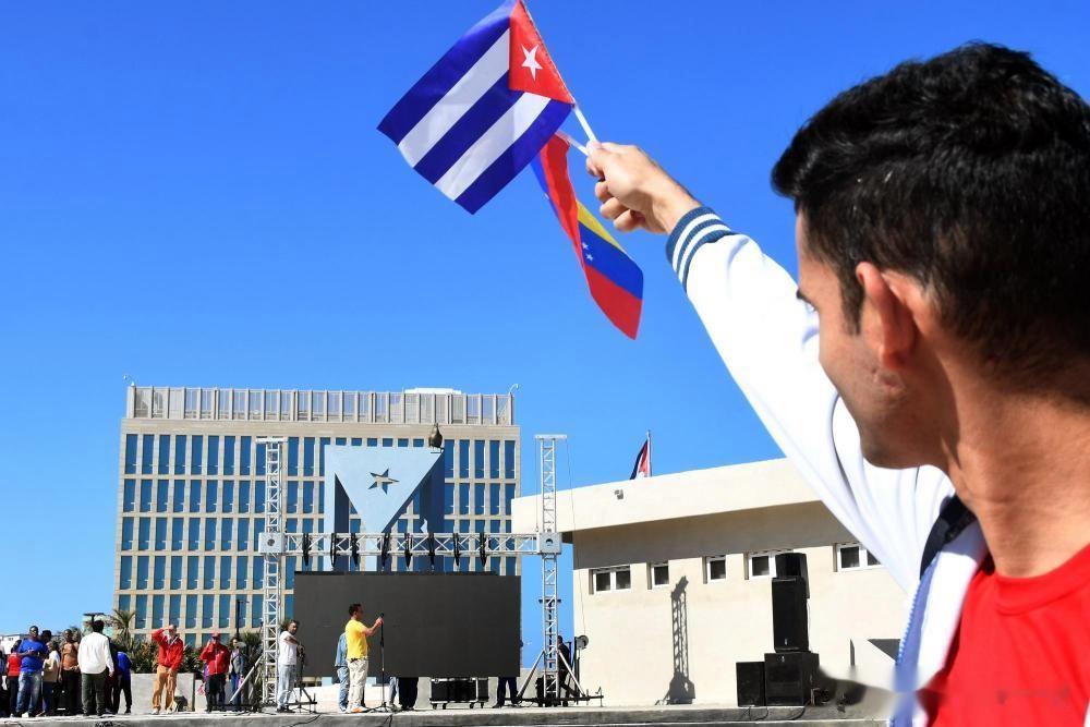 在古巴齐门哈瓦那,又名抗议者手握古巴和委内瑞拉国旗站在好意思国驻古巴大使馆前。