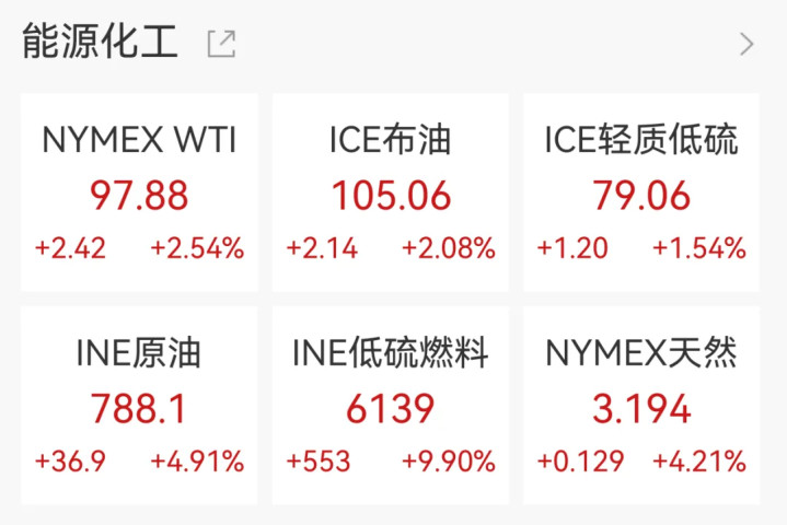 海外油价捏续走高,纽约期油涨2.54%,报97.88好意思元/桶,布伦特原油涨超2%报105.06好意思元/桶。