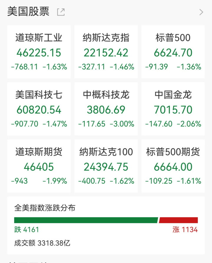昨日,好意思国三大股指全线收跌,结束两连涨。说念指跌1.63%,报46225.15点,跌近800点;标普500跌1.36%,报6624.70点,双双收于去年11月以来新低;纳指跌1.46%。