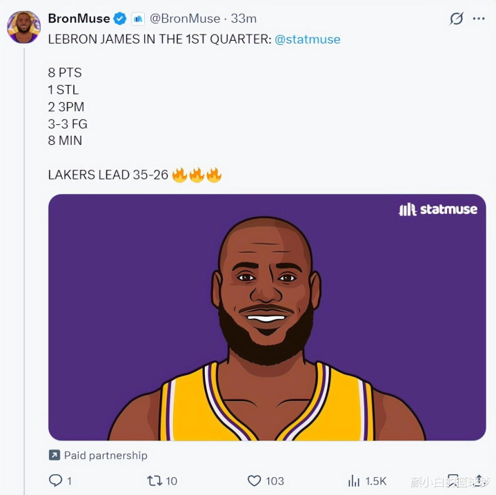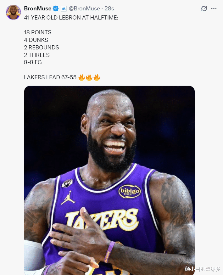 第二节的勒布朗依旧炸裂,他他的快攻依旧无解,这一节勒布朗单节暴扣3次,上半场照旧四次暴扣,17分钟,8中8,三分2中2,在莫得罚球的情况下照旧拿到18分2篮板1抢断1盖帽,射中率100%,三分射中率100%,他半场照旧拿了复出以来的最高分。