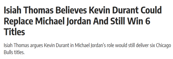 北京时刻3月27日,当被问及杜兰特与乔丹的对比时,“含笑刺客”伊赛亚-托马斯绝不踌躇地给出了不雅点,而他的表述角度,也让这场究诘转向了全新的主义。在《Run It Back TV》播客节目中,托马斯抛出了一个斗胆结论:若是把杜兰特放到往时那支芝加哥公牛队、顶替乔丹的位置,他降服甘休不会有任何不同——照样能拿六座总冠军。