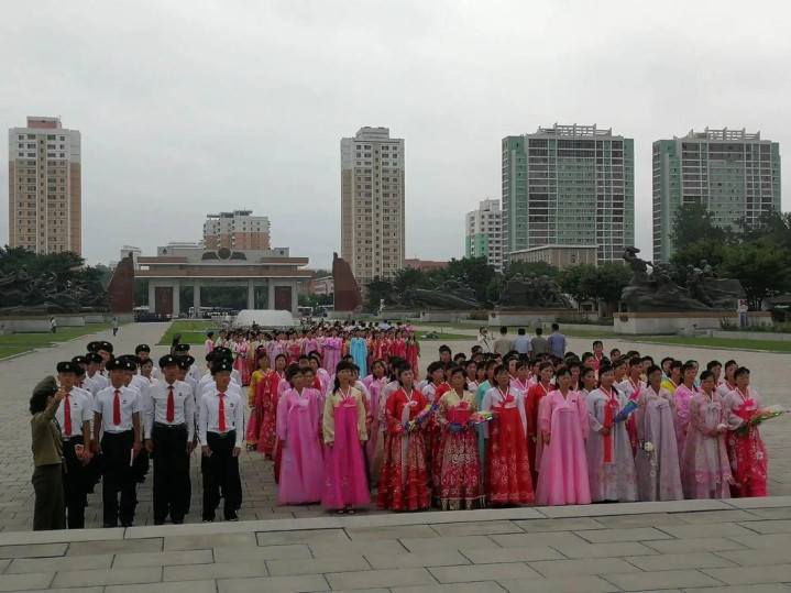 平壤的导游早就站成一行等着了,皆是二十露面的小姐,胸前别着首长徽章,衣服传统裙子,汉文说得很流利。