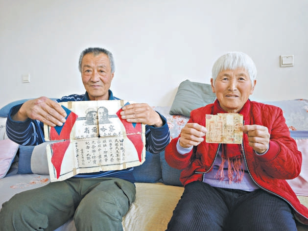 田万学(左)和爱东说念主于今仍珍存着田维林的义士证。本报记者孙延安摄