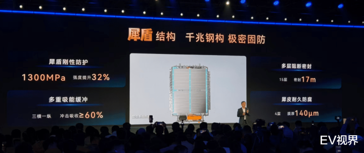 比如犀晶材料,对正极、负极、隔阂、电解液的舍弃标准,比国标还要严格,正极严16%、负极严20%、隔阂严14%、电解液严20%;还有犀盾结构,接受1300MPa的千兆钢构,强度擢升32%,15层多层阻断密封,三横一纵的多重吸能缓冲,能有用挣扎碰撞冲击。