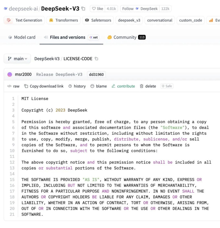 DeepSeek-V3 的公开仓库袒露,其代码文献经受 MIT License,其中明确条目保留版权声明和许可声明。