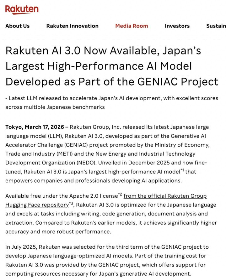 2026 年 3 月 17 日,日本乐天集团发布大模子 Rakuten AI 3.0,并将其界说为在日本经济产业省与 NEDO 鼓动的 GENIAC 技俩框架下设备的“日本国内最大范围高性能 AI 模子”。
