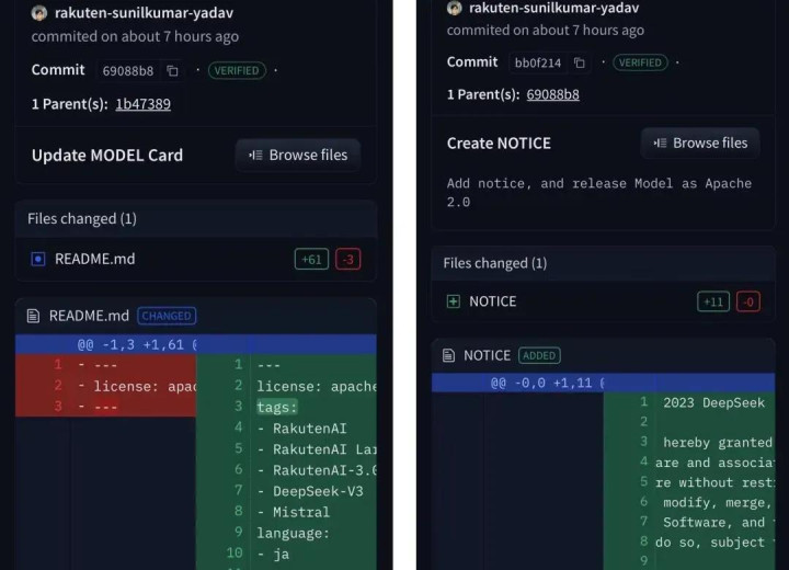 乐天的 Hugging Face 仓库首页则袒露技俩经受 Apache-2.0,同期提交纪录袒露,该仓库在当先上传后,又新增了 NOTICE 文献,并出现了 “Add the permission notice” 的提交讲明。这一变化进一步加重了外界对其签字和许可合规贬责是否充分的质疑。