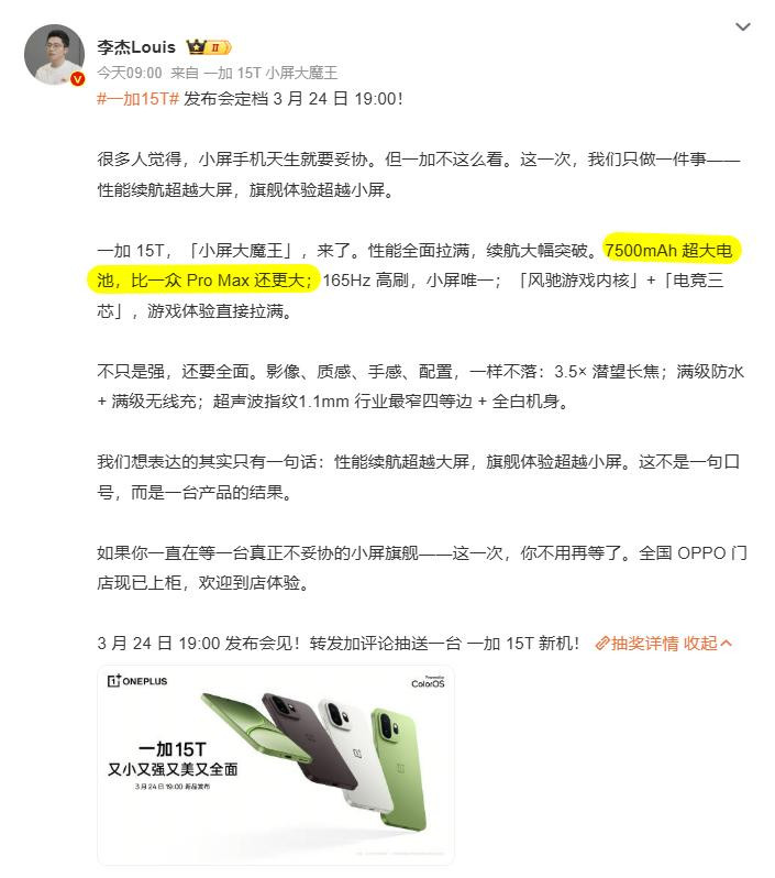 大屏手机横行的时间,小屏用户终于迎来了属于我方的年度神机!3月18日,一加官义结金兰式官宣,新一代小屏旗舰一加15T将于3月24日19:00发布,这款被定位为"小屏大魔王"的新机,用"小机身、大能量"的居品玄学,透顶冲突行业"小屏必减配"的固有偏见。