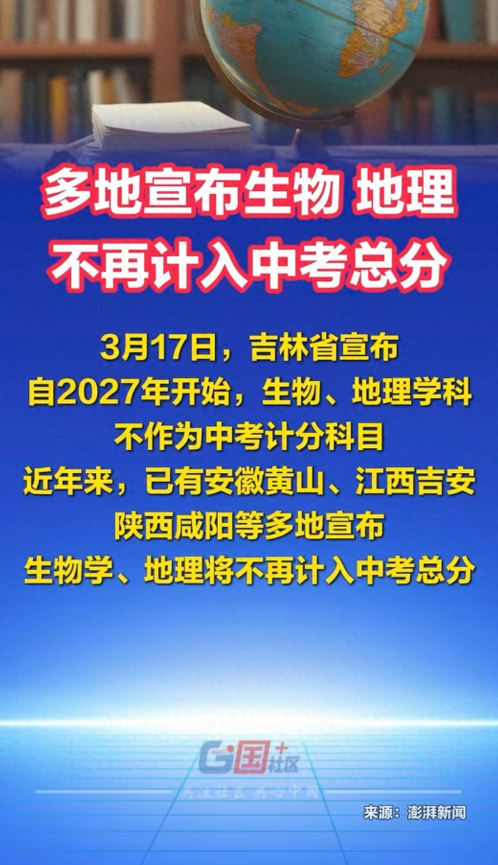 中考战略迎来重磅变动!吉林、安徽黄山、江西吉安等多地密集官宣,2027年起生物、地舆将厚爱不再计入中考总分,这一协调牵动万千家庭神经。